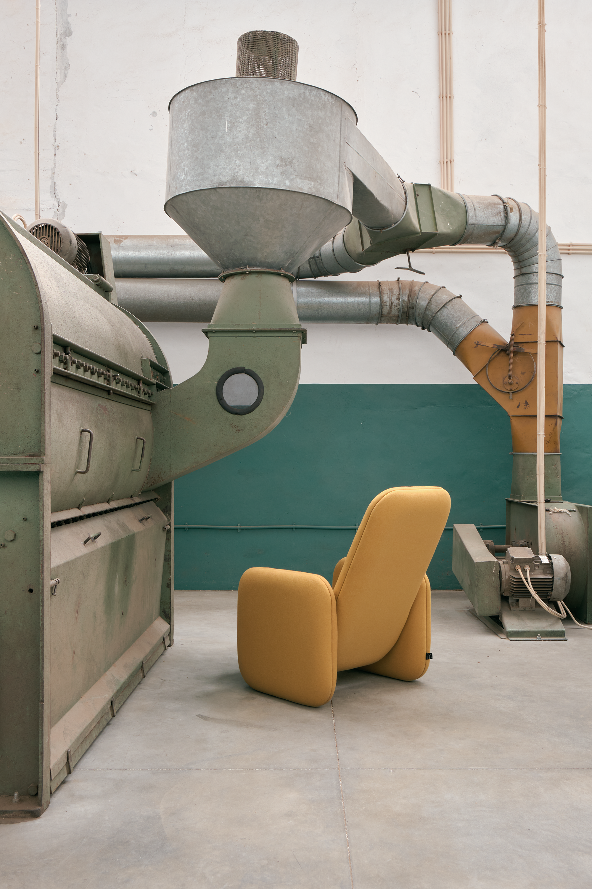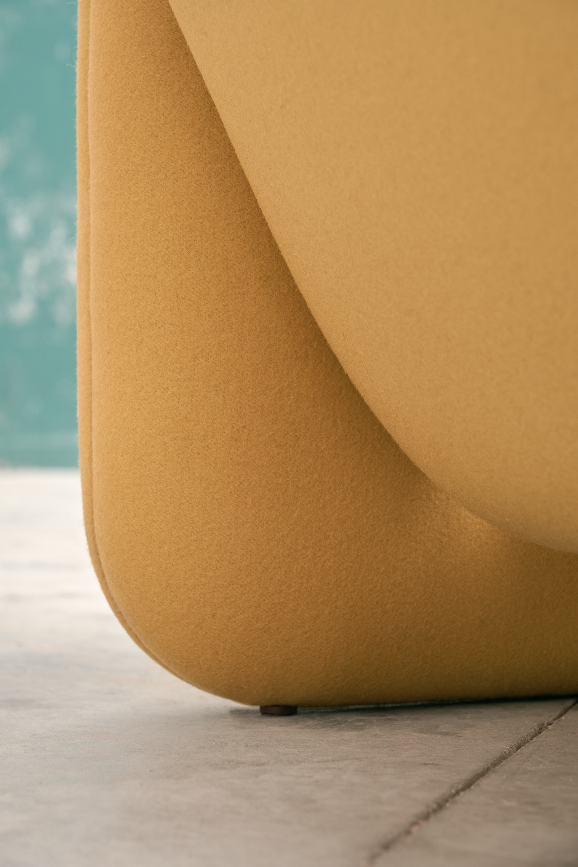 Armchair made in burel*, which incorporates the idea of plurality as a comfort enhancer, now transposed to the design through various cushions that come together to shape the object.